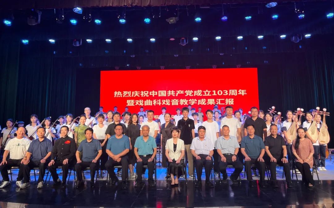 为热烈庆祝中国共产党成立103周年,传承红色基因,弘扬伟大的建党精神,铸牢中华民族共同体意识,增强师生凝聚力,7月1日晚,怀着对伟大的中国共产党的深厚感情,对中华民族伟大复兴的美好憧憬,我校戏曲科在三楼戏曲练功厅隆重举办了庆祝中国共产党成立103周年暨戏曲科戏音教学成果汇报演出。校党委书记张安平,校长刘丽,校党委委员、副校长杨战国出席,特邀音乐专家翟宝平、刘喜庆、韩培虎观看,戏曲科科长黄志群及戏曲科全体师生参加。
